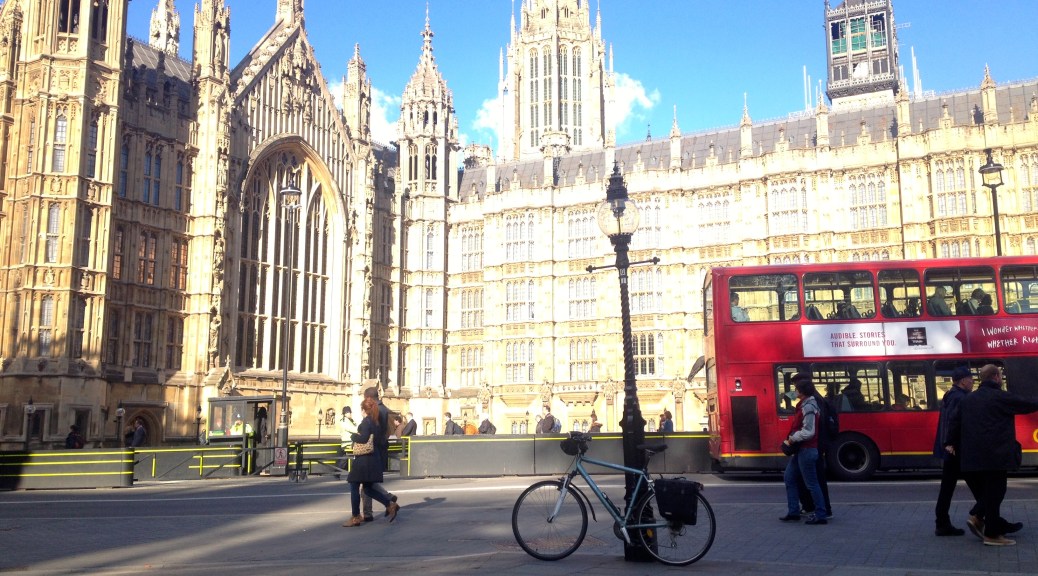 Crawley, Gatwick, Redhill, Coulsdon, Wimbledon, Wandsworth… au fur et à mesure que je m’approche du cœur de la capitale, le paysage se densifie et se dresse, le maillage des routes se resserre. A l’approche de Battersea Park (suis-déjà dans Londres ?), mon pneu arrière crève. C’est idiot, mais c’est la première fois que cela m’arrive, et je me trouve un peu nigaud devant ma roue dégonflée. Je change ma chambre à air, mais une manipulation maladroite me la fait crever plus gravement encore… Je remets donc l’ancienne… Et là, si près du but, je me mets en colère contre moi-même. L’espace d’un instant, je pense que le plaisir d’arriver enfin va être gâché par cet incident. Je regarde ma montre et calcule le temps qu’il me reste avant le départ de mon train. Je pensais être large, je pressens que je devrais peut-être finalement passer la nuit ici. Le vélo à mes côtés, je marche à une cadence toute militaire. Mais en atteignant enfin la Tamise, je reprends espoir, et une fois que je l’ai traversée, je retrouve toute ma motivation. Je regonfle mon pneu endommagé et je pars à l’assaut de la capitale anglaise – Westminster Abbey, Trafalgar Square, etc.