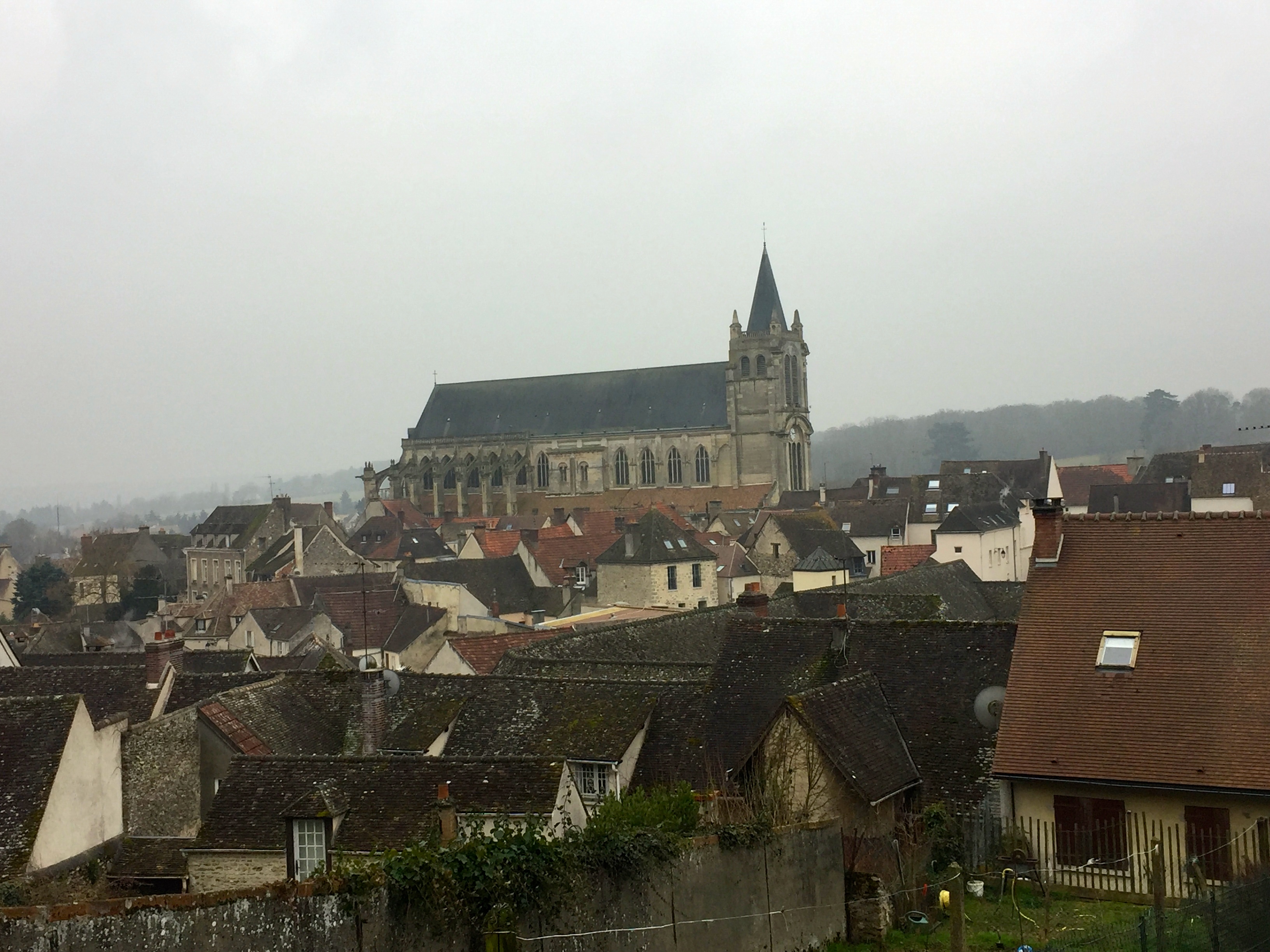 Je repars le lendemain matin alors que la nuit se dissipe tout juste. Peu avant Méré, une fine neige se met à tomber en virevoltant doucement. Mais, bien qu’il fasse froid, elle est trop légère pour laisser la moindre pellicule blanche sur la terre. À Montfort-l’Amaury, elle ne tombe plus. Montfort-l’Amaury, voilà encore une ville qui ne doit sa place dans ma géographie mentale qu’à un panneau sur l’autoroute ou des commentaires lors des informations sur le trafic routier. Il doit y avoir beaucoup d’embouteillages sur la Nationale 12 au niveau de la sortie de Montfort-l’Amaury (À moins que je ne confonde avec Maisons-Alfort ou Saint-Fort-sur-le-Né). Je ne tarde toutefois pas à regretter ma méprisante ignorance : Montfort-l’Amaury, dont un panneau m’apprend qu’elle est jumelée avec Nickenich en Allemagne, est une charmante commune d’où émerge une superbe église de style gothique, majestueuse comme une cathédrale. Sur une butte se dressent les ruines d’un château construit par Robert II au Xe siècle et détruit par les Anglais pendant la guerre de Cent Ans, laissant seulement quelques pointes dressées, restes de ce qu’on appelle la Tour d’Anne de Bretagne.